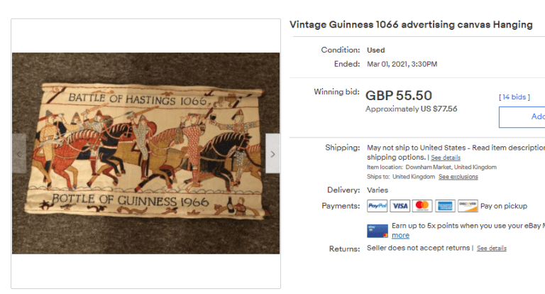 Below, someone took the Guinness “Bayeux tapestry” tea-towel that comes up every so often, stained it to look old, put some wood dowels on it to make it look like a hanging, then sold for $77. Good for seller, buyer could have done better. I bought one for $25, roughly the going market price. Note – on the download page I do give you a FREE full size, high resolution, image of this advert to print out and frame.