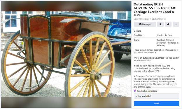 I liked this Killarney jaunting car when I saw it, but it’s too big for a small home bar. If I had a commercial bar, it would make a cool seating area.