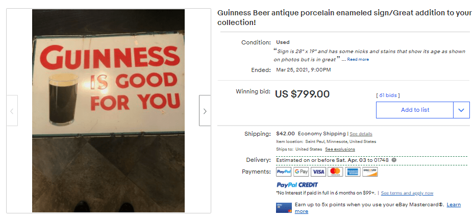 I’d kill for one of these original porcelain Guinness signs. If anyone has one to sell, send a note. Someone had one up recently for $600 but then withdrew sale.